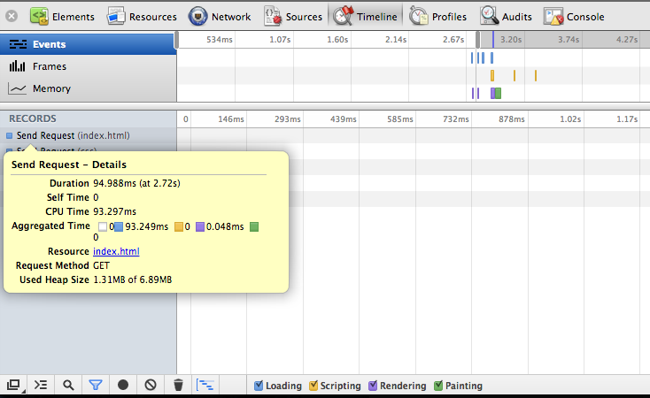Gives you a complete overview of where time is spent when loading and using your web app or page. All events, from loading resources to parsing JavaScript, calculating styles, and repainting are plotted on a timeline.